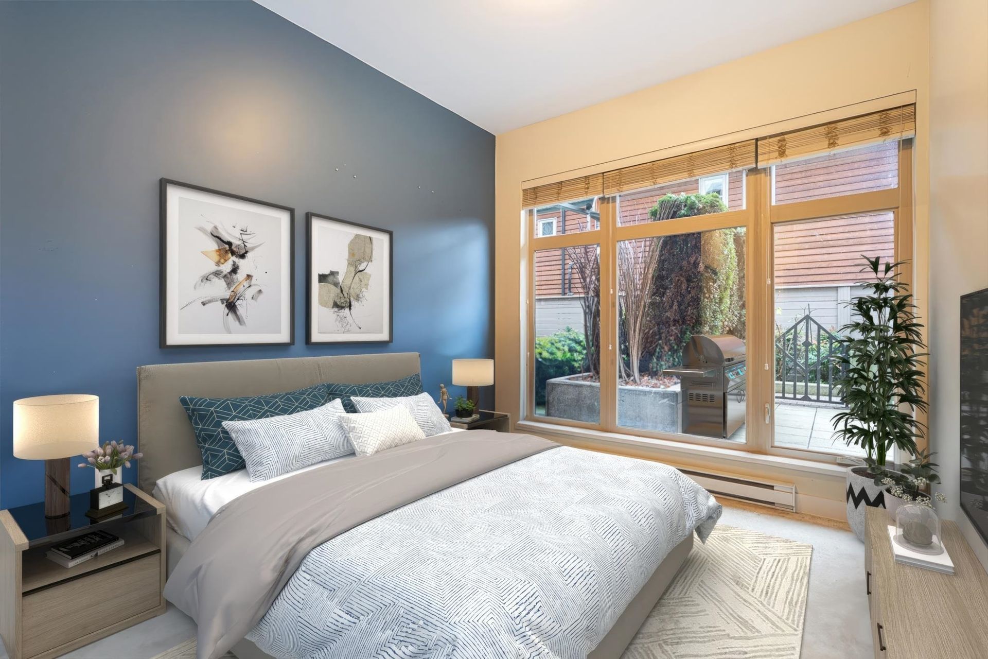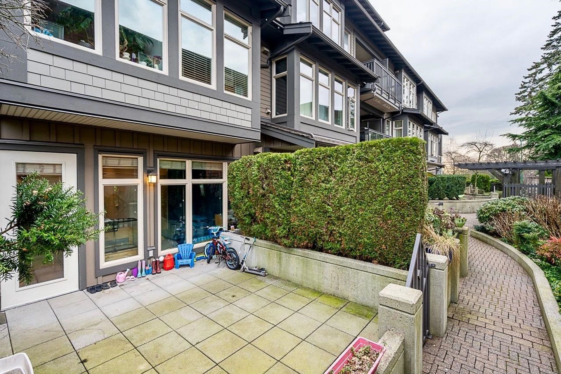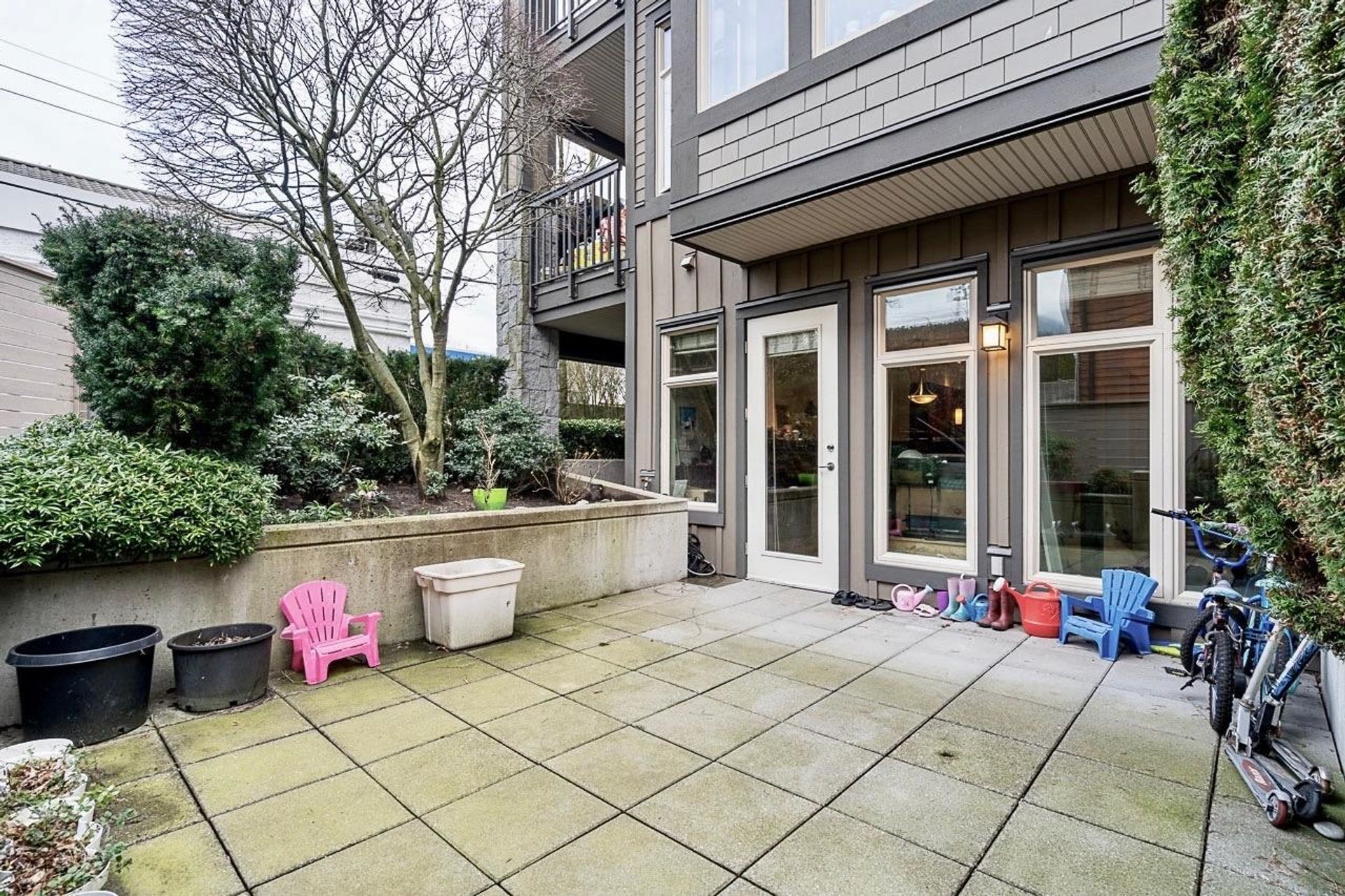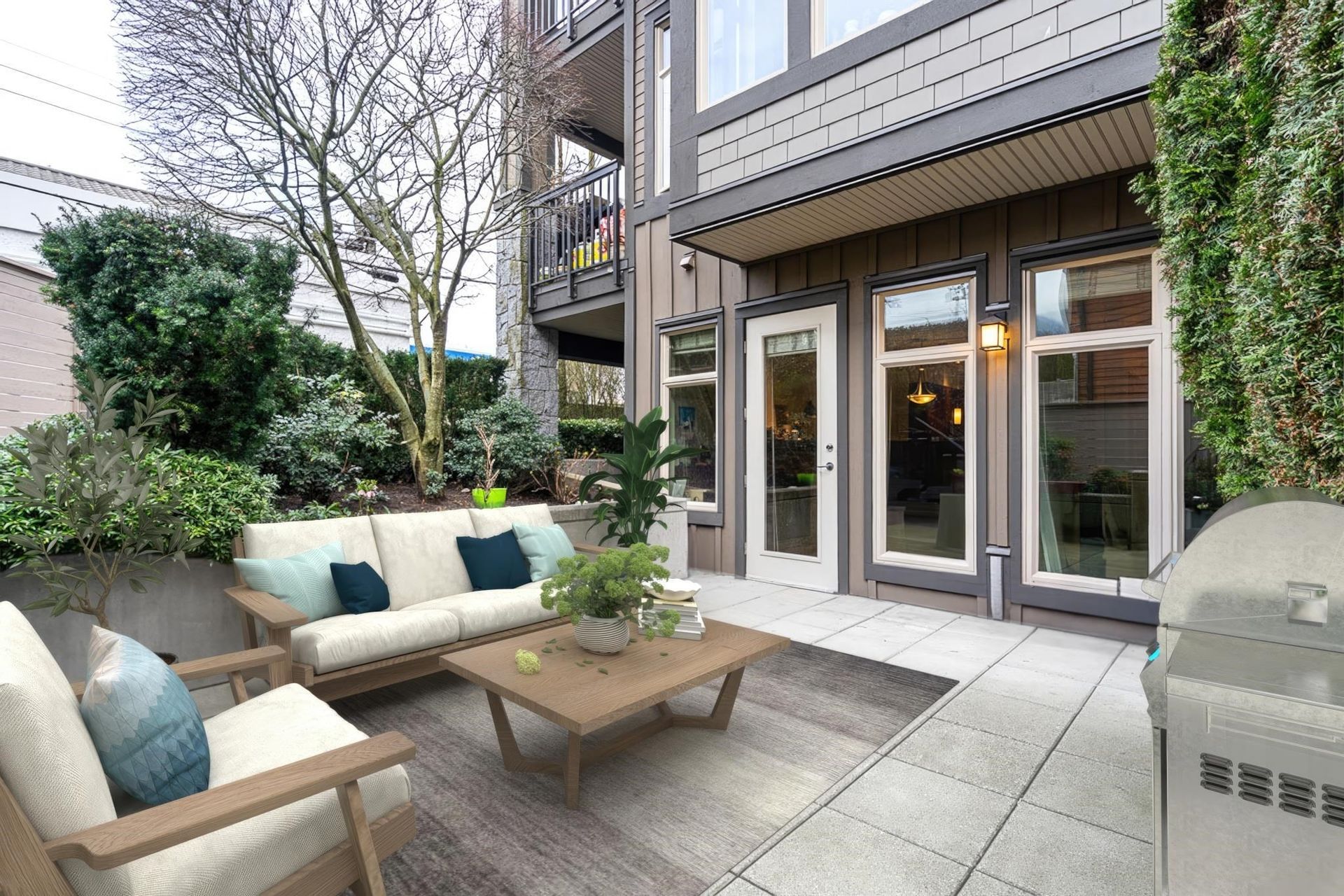 Private, Quiet, & Secure! Spacious 1 Bdrm home lives just like a townhome with it's own private entrance. End unit with just under 700 sq ft inside. Includes a dramatic stone gas fireplace, in suite Laundry + huge private 200+ sq ft garden patio. Open concept layout with 10' ceilings & well appointed kitchen with granite countertops, full size stainless steel appliances & gas range. The semi-ensuite bathroom has in-floor radiant heat. This beautiful home is easily heated in the winter with just the natural gas fireplace; gas is included in maintenance fees (only $359/month) & home is cool in the summer. Close to schools, shopping, transit, restaurants & the Harry Jerome rec centre. Pet Friendly. 1 parking + 1 storage locker. Well funded strata.